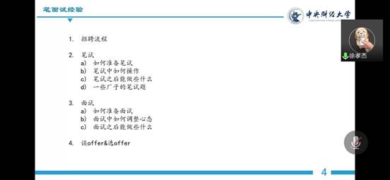 徐孝杰,2018级应用统计专业硕士研究生,目前已经成功录用于腾讯公司数据分析岗。徐孝杰学长先后在滴滴、美团等互联网公司实习,强调在实习过程中不要躲在自己的舒适区,不要只是简单地完成自己任务的输出,这样不会有所成长。他分享了在求职过程中的文件夹,里面有所投递公司的进度表,自己的简历、笔试以及面试的记录和复盘,还有所有求职过程中所需要的其他材料。他推荐同学们在求职过程中也需要这样认真对待,最终的求职结果一定也不会辜负你。他还细心地提醒大家,在接到公司的offer电话时,一定要明确自己的工作地点、薪资构成等细节问题,方便offer对比分析。