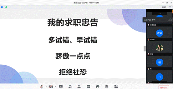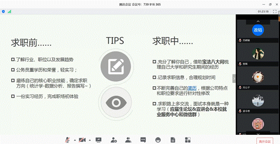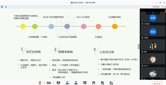 继2020年度两场研究生线上就业经验分享交流会后,4月24日、30日,研究生就业指导系列活动的公务员专题、互联网专题公开课在腾讯会议平台成功举办。公司研究生会邀请到六位员工及在校生分享了他们在公务员及互联网领域的求职经验。来自永利集团304am登录、财政税务公司、金融公司、会计公司、保险公司等多个公司数百名研究生和本科生通过直播和回放参与其中。两场分享会均由公司研究生会主办,公司研究生会副主席杜晨箐主持。