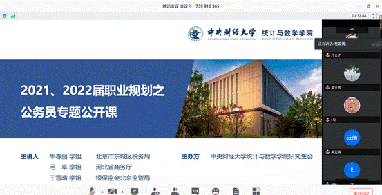 牛春丽,2016级应用统计专业硕士研究生,现就职于北京市东城区税务局。“职业是才华与追求的最大化平衡”,她从职业选择、公务员的日常、公务员的备考三个方面展开讲述。在职业选择上要同时兼顾个人中长期的发展规划、时间与收入的需求比例、重心是放在个人发展还是家庭、对个人性格的基本判断、是否有考公务员的决心这五个要素。她强调公务员的备考要保持专注,在浮躁的求职就业环境中保持平和坚定的心态。最后,她送给大家一句话:“求职就是求解线性规划的最优解,我们要找到适合自己的最优点”。