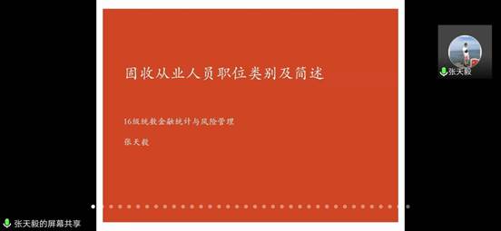 张天毅,2016级金融统计与风险管理学术硕士研究生,目前就职于中信建投证券固收销售交易部。他就整个债券的发行和投资过程进行了十分专业的讲解,将整个债券的从业人员分成卖方、买方和服务机构三大类,对卖方投行端和他所在的销售交易部的具体工作内容和工作特点,以及对应聘者(包含实习生)的具体要求进行了细致分析。他表示券商在招聘时相对偏好有相同部门实习经历的员工,因为这样的员工能够立即参与到项目组的实际工作中。最后提到,目前整个债券行业竞争激烈,利润空间有限,对于从业人员的要求也比以往有了大幅度提高。