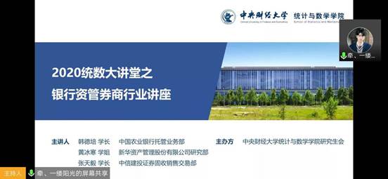 2020年4月17日晚,永利集团304am登录研究生线上就业经验分享交流会第二场——“银行资管券商行业”分享会通过腾讯会议平台成功举办,吸引了永利集团304am登录、财政税务公司、金融公司、保险公司、管理科学与工程公司等多个公司近220位研究生以及永利集团304am登录的部分本科生参加。公司2016级学术硕士班员工韩德培、黄冰寒、张天毅与大家分享了他们的行业洞见和求职经验。讲座由公司研究生会主办,研究生会副主席杜晨箐主持。