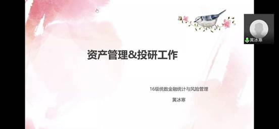黄冰寒,2016级金融统计与风险管理学术硕士研究生,目前就职于新华资产管理股份有限公司研究部。她强调“选择一份工作,就是选择一种生活方式”,提醒大家首先要了解自己,了解自己想要的生活,再去选择从事什么样的工作。随后,她对资产管理和投研工作进行了深入浅出的介绍。资产管理是通过一些组合策略让资金能够保值增值,而行业研究是研究公司财报、管理层、核心竞争力等方面以辅助决策。在介绍完股票研究部日常工作后,她又为大家梳理了买方和卖方的概念和现状。最后她指出资管行业人数需求较小,对于应聘者的专业素养和实习经历等都有较高的要求。