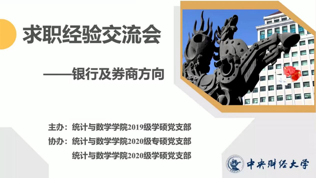 3月5日晚7点30,在公司党委和老师的领导与帮助下,由永利集团304am登录2019级学硕党支部主办的“执子之手,与子共进”职业发展系列活动,以线上会议形式成功举行。本次活动聚焦在银行券商行业,邀请了1998级统计学专业韩喜悦学姐、2003级经济数学专业王玮敏学长、2017级博士袁子乾学长、2018级数量经济学硕秦玉东学长和2019级应用统计专硕吕政韬学长、白誉学姐和大家分享交流。本次活动由2019级学硕党支部书记赵宇晗主持。