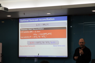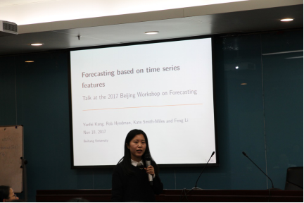 下午会议的第二个议题内容是“概率预测”,Hyndman教授讲解“概率分层预测”,对分层时间序列数据中的重要概念进行了定义,并在多种假定条件下进行了研究,将结果展示给了在场的各位嘉宾。李丰博士做了“基于协变量相关的条件Copula预测”为题的演讲,李丰博士详细介绍了贝叶斯方法和蒙特卡洛在复杂时间序列模型预测的应用。随后,由北京航空航天大学的康雁飞教授作了题为“时间序列特征空间预测”的报告,她提出对时间序列数据集特征空间降维并利用特征空间对预测方法进行选择的时间序列预测方法。该项目受“304永利集团官网入口教师邀请海外学术伙伴来校开展合作科研项目”资助,项目号:HZKY20170025。