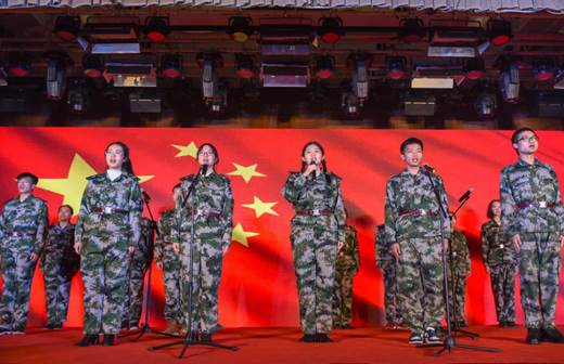 在祖国成立70周年之际,中财学子身披蓝衣,手握桃花,组成浩浩荡荡的国庆“春潮滚滚”方阵给全世界留下了深刻的印象,完美的展示了身为华夏儿女的自豪。华夏大地,多少英雄儿女熠熠生辉,用生命践行对祖国的誓言,合唱《当祖国召唤的时候》,既代表了2019级新生军训中的历练与成长,又象征着中财学子听从祖国召唤的人生使命,为整场晚会奠定了恢弘壮丽的基调。