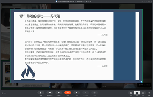 汇报人陈哲昂则从“青年应该有使命感”出发,认为青年首先要清楚青年应该“想什么、做什么”,要把命运与国家联系在一起。紧接着,他通过“90后”以及身边学长的抗疫事迹阐述了青年应该勇于担当,在大难临头之时敢于献身,成为一个有为青年,实现自己的社会价值。