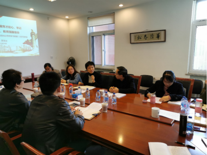 会议伊始,理论中心组成员薛玉山老师做“不忘为党育人、为国育才初心,牢记‘双一流’建设、教育强国使命——学习《习近平新时代中国特色社会主义思想学习纲要》”主题发言。薛老师从“双一流”建设的初衷、什么是“双一流”、不忘初心,坚守情怀、如何落实“双一流”建设四个方面出发,讲述了如何牢牢抓住立德树人的根本任务,牢记教育初心,致力“双一流”建设。